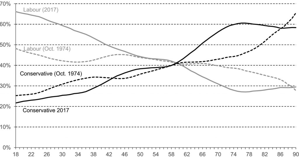 Figure 1: Proportion of voters voting Conservative or Labour by age, October 1974 and 2017 general elections.