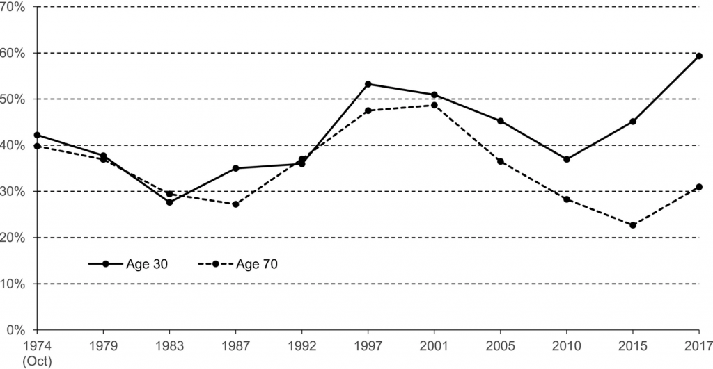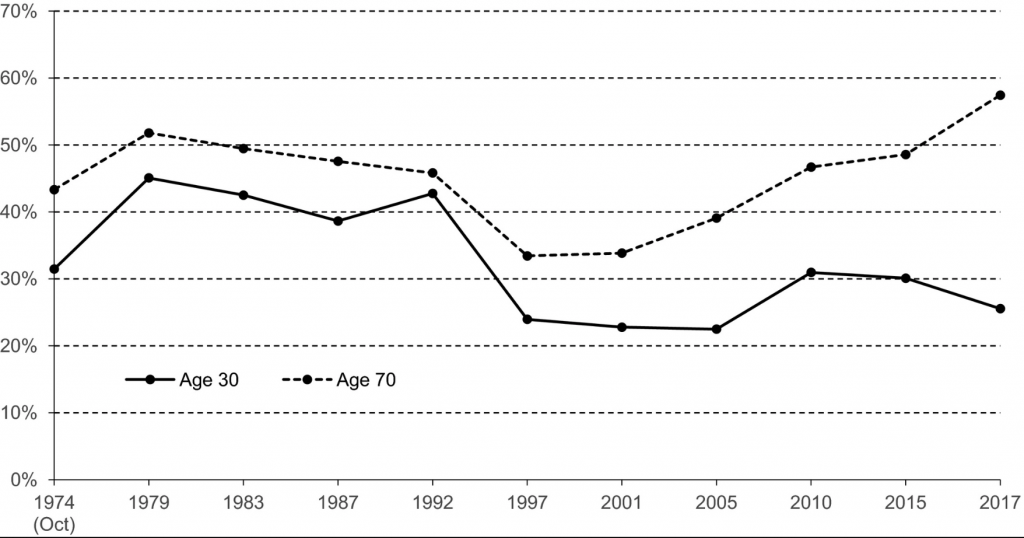 Figure 3: Proportion of thirty? and seventy?year?old voters voting Conservative at general elections since October 1974.