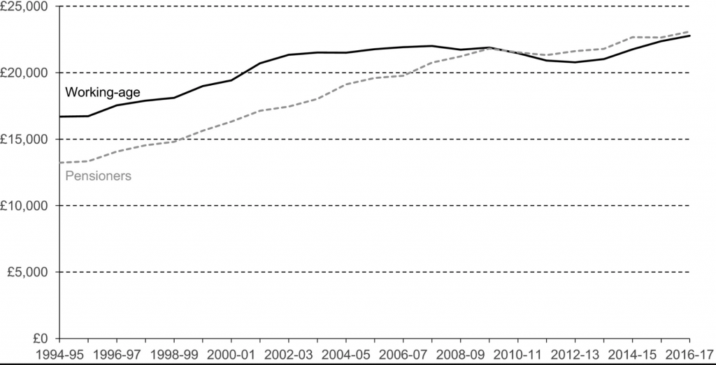 Figure 7: Median UK household incomes after housing costs, working age and pensioner households, 2016–17 prices.