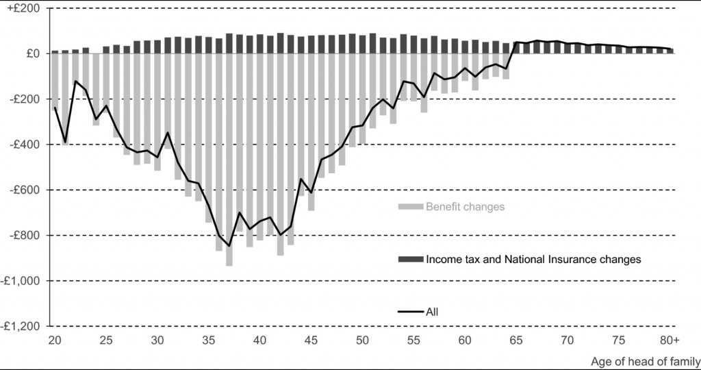 Figure 9: Mean change in annual net family income from tax and benefit policy changes implemented during the current Parliament, by age: UK, 2022–23.