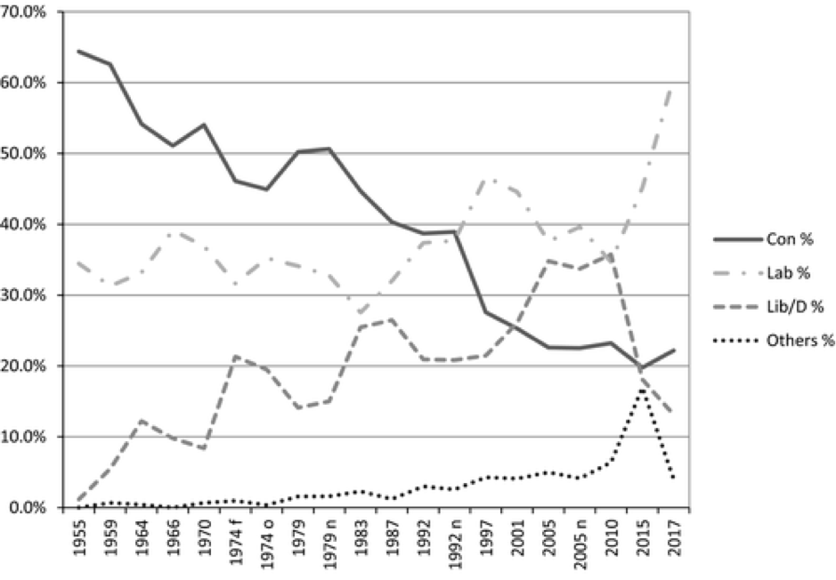 The long?term change in these villa and provincial west end seats between 1955 and 2017 is startling (see Figure 2). In 1955, each one was Conservative, usually by a big margin. But the Conservatives last won a contest in any of them in 1992. By 2017, Labour won every seat and had a 39 percentage point lead over the Conservatives. Although 2017 was particularly dramatic, the change has been gradual and continuous: in every election since 1959, Labour has beaten the national swing in this group of seats.