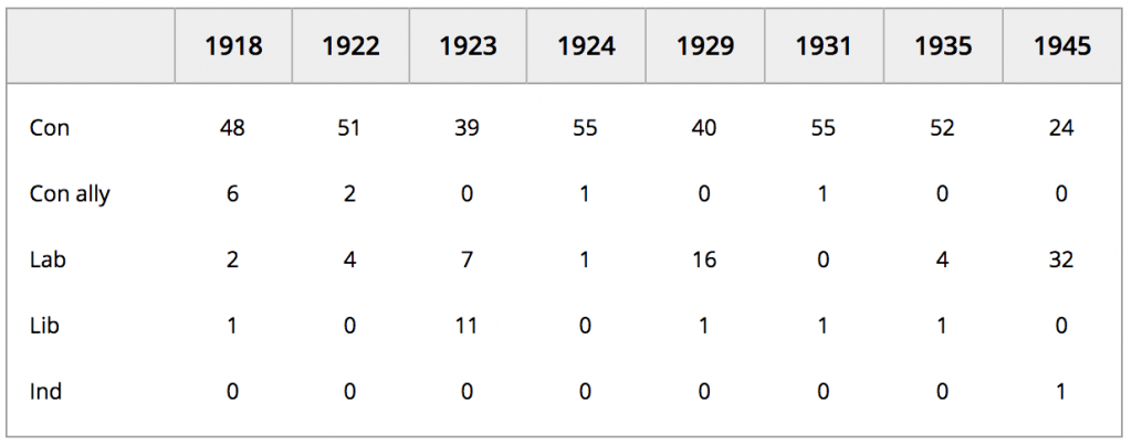 The causes of Labour’s increase of vote share in these areas are a combination of an outward movement of the population to interwar suburbia, the breaking up of villas into flats, and Labour’s increasing appeal to middle class electors. My article on this subject has more details.