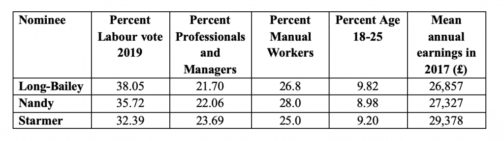 However, parties nominating Nandy had the highest concentration of manual workers, so Long-Bailey did not have a monopoly of support from CLPs in working class constituencies. Furthermore it is clear that constituencies nominating Starmer were more likely to be in marginal seats and have more middle-class voters.
